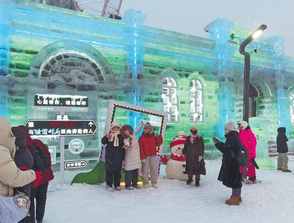 自第二十七屆哈爾濱冰雪大世界開園至今,冰雪郵局日均接待游客近5000人,元旦假期每天接待游客超萬人。今年的冰雪郵局遷移至園區(qū)內(nèi)地標性建筑——“雪花摩天輪”之下,采用“暖屋+冰燈包裹”的建筑設(shè)計。冰雪郵局推出的近300種涵蓋地方風光與冰雪文化的封片及文創(chuàng)產(chǎn)品受到游客歡迎,門口的冰雕郵筒、雪娃娃和明信片留影框也吸引了眾多游客駐足打卡。
