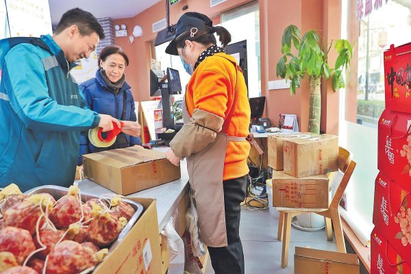 春節(jié)前夕,“土味年貨”的銷售與寄遞進(jìn)入高量期。江蘇郵政積極做好收寄服務(wù),全力保障郵件時限,自1月以來,生鮮品類郵件業(yè)務(wù)量同比增長61.9%。圖為南京市郵政分公司中華門支局員工來到一家桂花鴨專賣店,為客戶提供年貨隨買隨寄服務(wù)。