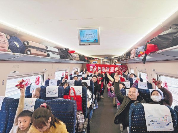 2月4日,G3724次高鐵上,重慶郵政工作人員陪伴老鄉返鄉過年?! 跷很啊z