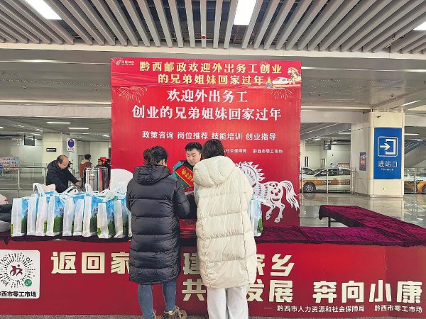 2月2日,貴州省黔西市郵政分公司聯合人社部門,在高鐵站為返鄉人員提供暖心服務?! 跣啞z