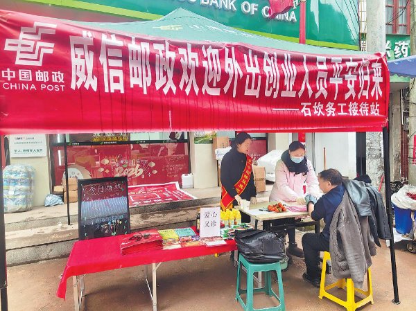 2月10日,云南省威信縣郵政分公司設立接待站,為返鄉人員提供義診服務?! 踵嵣ァz
