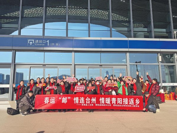 2月9日,安徽省青陽縣郵政分公司聯合縣人社局,在浙江臺州高鐵站免費接務工老鄉返鄉?! 鯇庢谩z