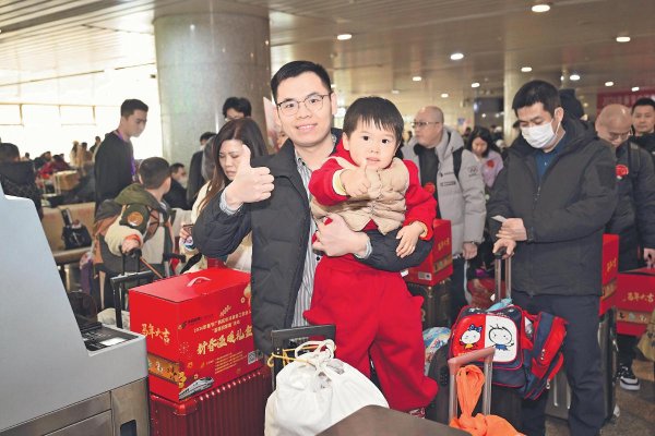 2月10日,廣西壯族自治區郵政分公司在北京西站參與舉辦廣西在京津冀務工創業人員“溫暖回家”活動,并送上新春禮包,贏得老鄉父子點贊。 □趙明震 攝